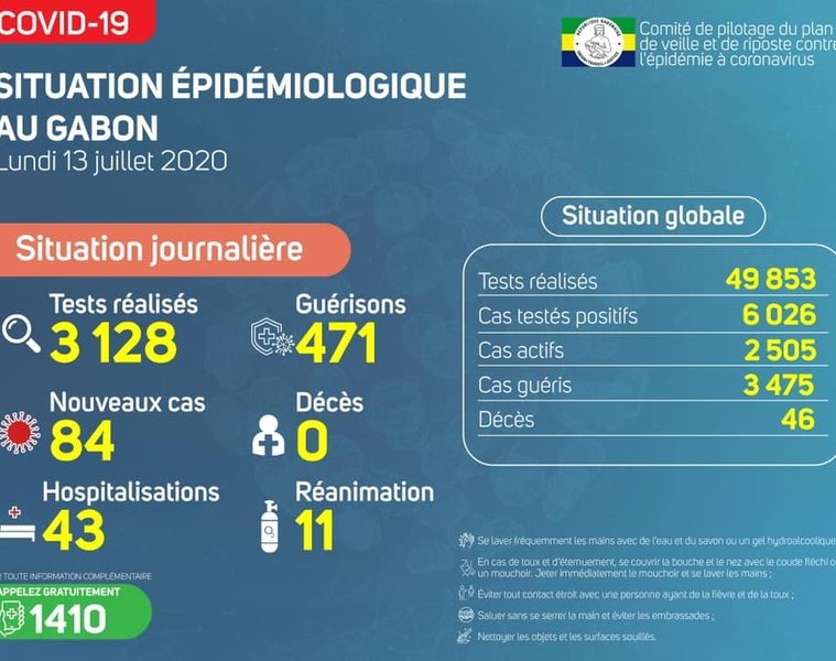 Gabon Matin vous livre le point journalier du Comité de pilotage du plan de veille et de riposte contre l’épidémie à Coronavirus au Gabon du 13 juillet 2020.