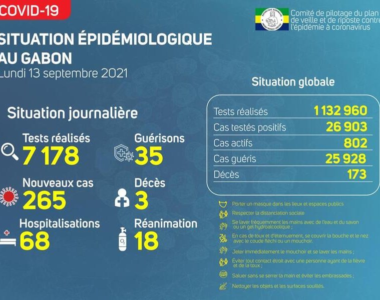 Nous avons enregistré 265 nouveaux cas positifs sur 7 178 tests réalisés, soit un taux de positivité de 3.7%, 68 personnes hospitalisées dont 18 en réanimation pour détresse respiratoire, 35 nouvelles guérisons et 03 nouveaux décès à Libreville.