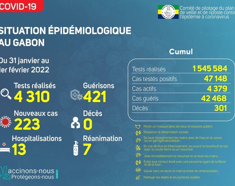 GabonMatin vous livre le point journalier du Comité de pilotage du plan de veille et de riposte contre l’épidémie à Coronavirus au Gabon du 1er février 2022.