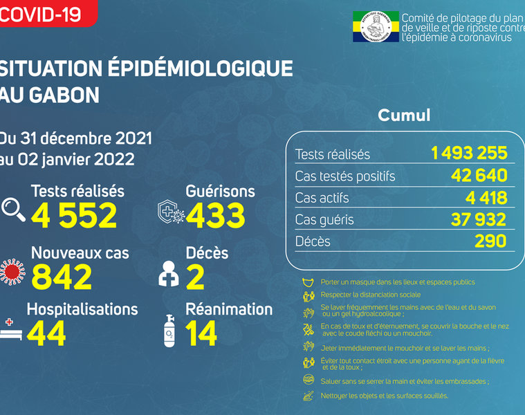 GabonMatin vous livre le point journalier du Comité de pilotage du plan de veille et de riposte contre l’épidémie à Coronavirus au Gabon du 2 janvier 2022.