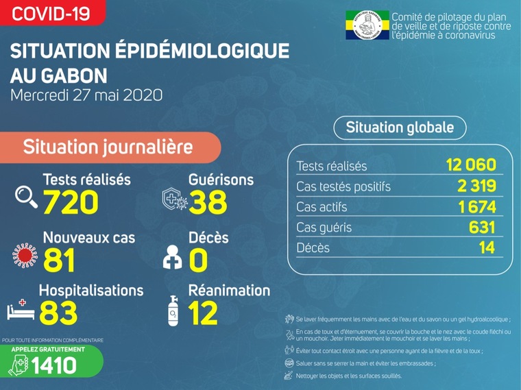 Gabon Matin vous livre le point journalier du Comité de pilotage du plan de veille et de riposte contre l’épidémie à Coronavirus au Gabon du 27 mai 2020.