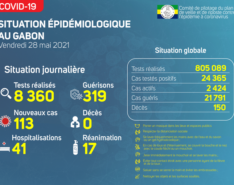 Gabon Matin vous livre le point journalier du Comité de pilotage du plan de veille et de riposte contre l’épidémie à Coronavirus au Gabon du 28 mai 2021.