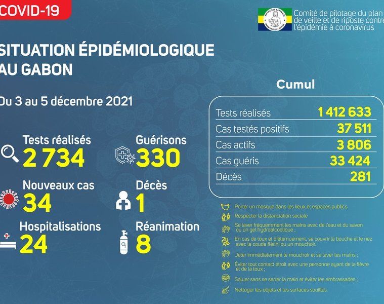 Gabon Matin vous livre le point journalier du Comité de pilotage du plan de veille et de riposte contre l’épidémie à Coronavirus au Gabon du 5 décembre 2021.
