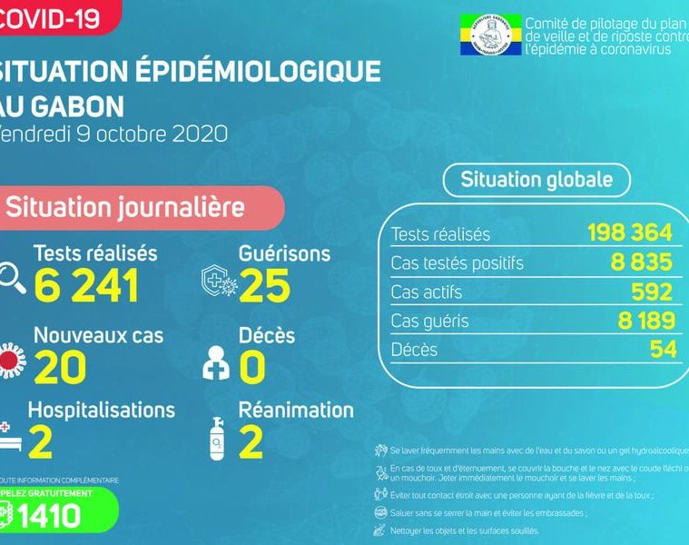 Gabon Matin vous livre le point journalier du Comité de pilotage du plan de veille et de riposte contre l’épidémie à Coronavirus au Gabon du 9 octobre 2020.
