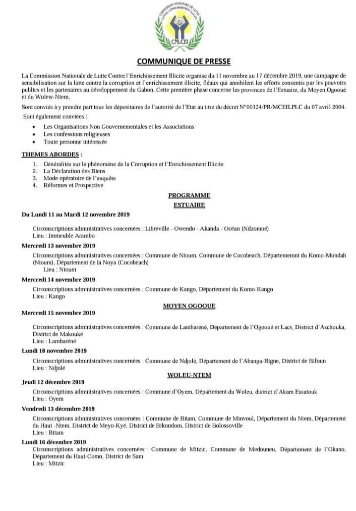 La Commission Nationale de Lutte Contre l’Enrichissement Illicite organise du 11 novembre au 17 décembre 2019, une campagne de sensibilisation sur la lutte contre la corruption et l’enrichissement illicite, fléaux qui annihilent les efforts consentis par les pouvoirs publics et les partenaires au développement du Gabon. Cette première phase concerne les provinces de l’Estuaire, du Moyen Ogooué et du Wolew-Ntem.