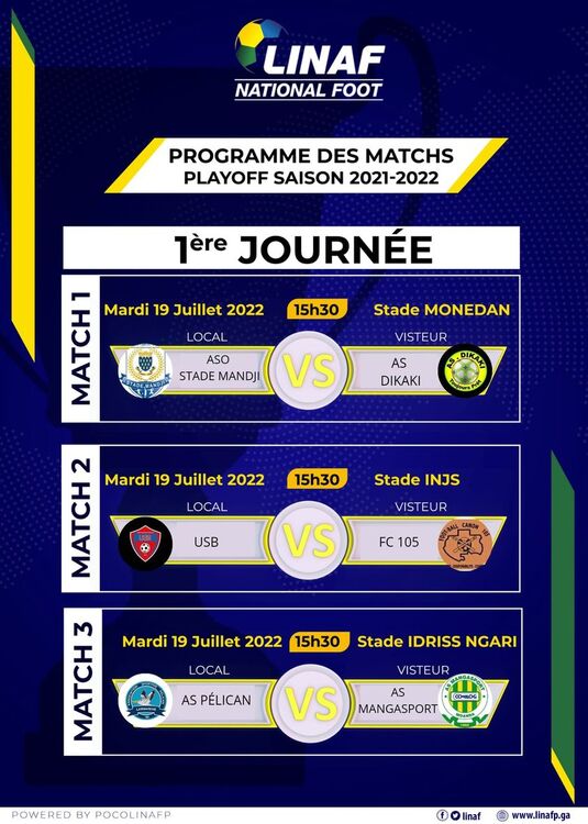 La phase des playoffs, quant à elle se jouera exclusivement dans le Grand Libreville en 18 rencontres de six journées. Cette ultime étape qui débute ce mardi 19 juillet avec trois confrontations à savoir Stade-Mandji face à l’As Dikaki au stade Augustin Monedan de Sibang, l’US de Bitam au FC 105 et l’As Pélican à Mangasport, va nous révéler le vainqueur de cette édition 2022, le remplaçant de Bouenguidi Sports au titre, au soir du 31 juillet prochain.