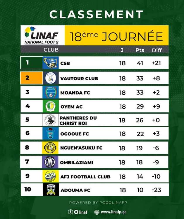 Le Vautour Club des Forces de police nationale (FPN) et le Centre Sportif de Bendjé (CSB) de Port-Gentil, respectivement vice-champion et champion national de deuxième division gabonaise vont évoluer la saison prochaine en National-Foot 1.