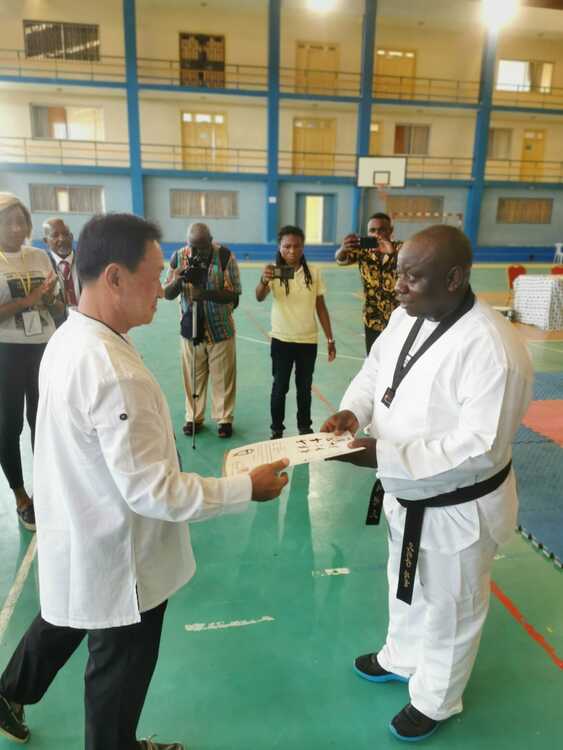 En marge de la cérémonie de clôture présidée par le directeur de cabinet du ministre des Sports, accompagné du secrétaire général du comité national olympique gabonais et du président de la Fédération gabonaise de Karaté (Fegakama), le grand maitre Park Sang Chul a été élevé au poste de président d’honneur de la Fédération gabonaise de taekwondo.