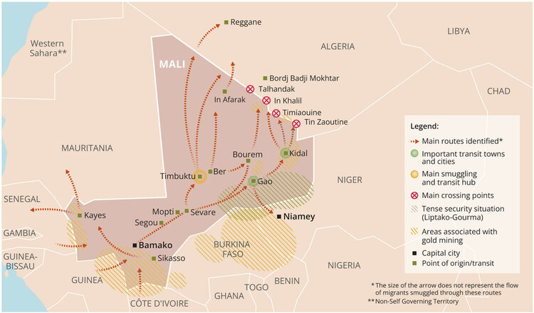 Principaux itinéraires de trafic de migrants dans et vers le Mali (2020/2021)