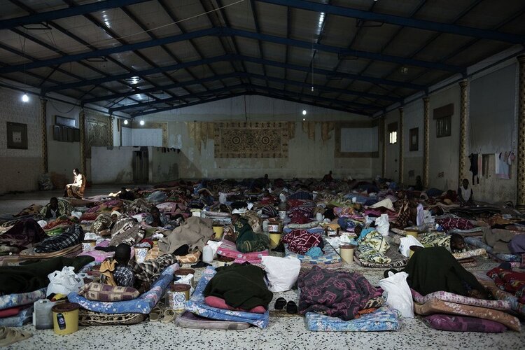 Des migrants sont couchés sur des matelas à l’intérieur d’un centre de détention, situé en Libye. (archive)